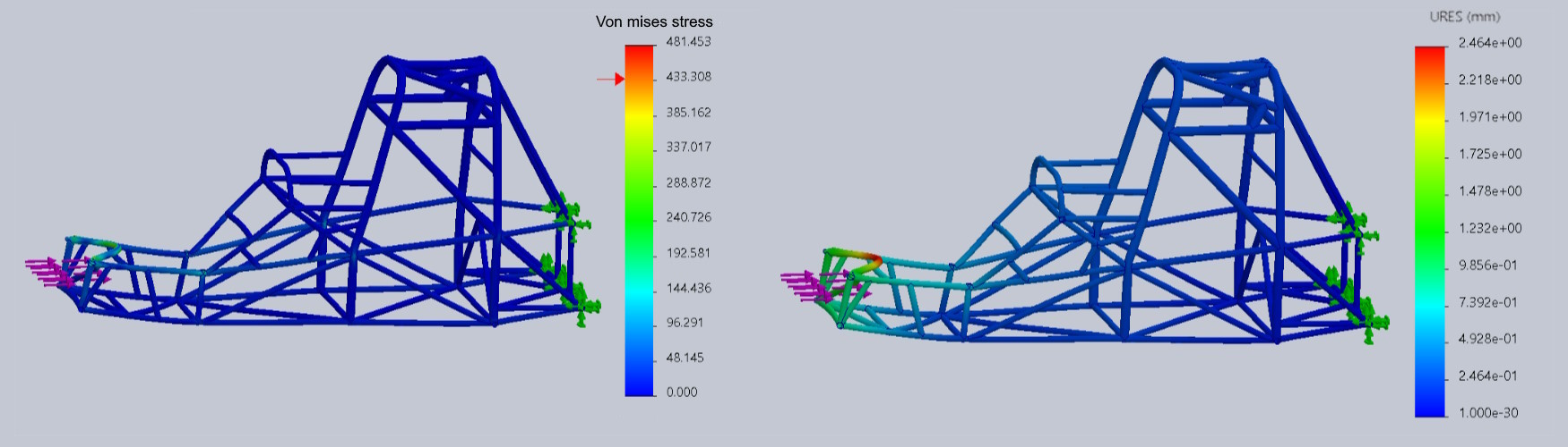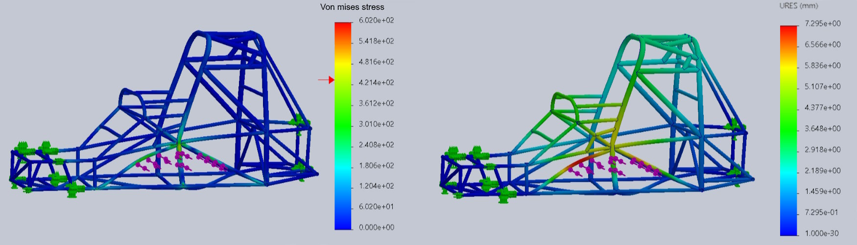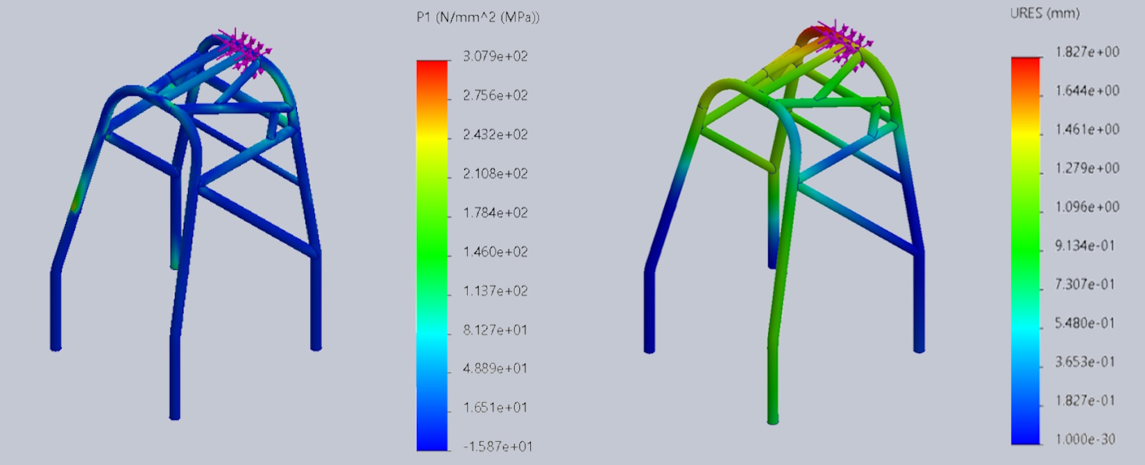 Rear Roll Cage Combined Loading (Left: Red elements show stress of 308 MPa, which is less than the yield strength of 435 MPa, Right: Red elements show deformation of 1.8mm)