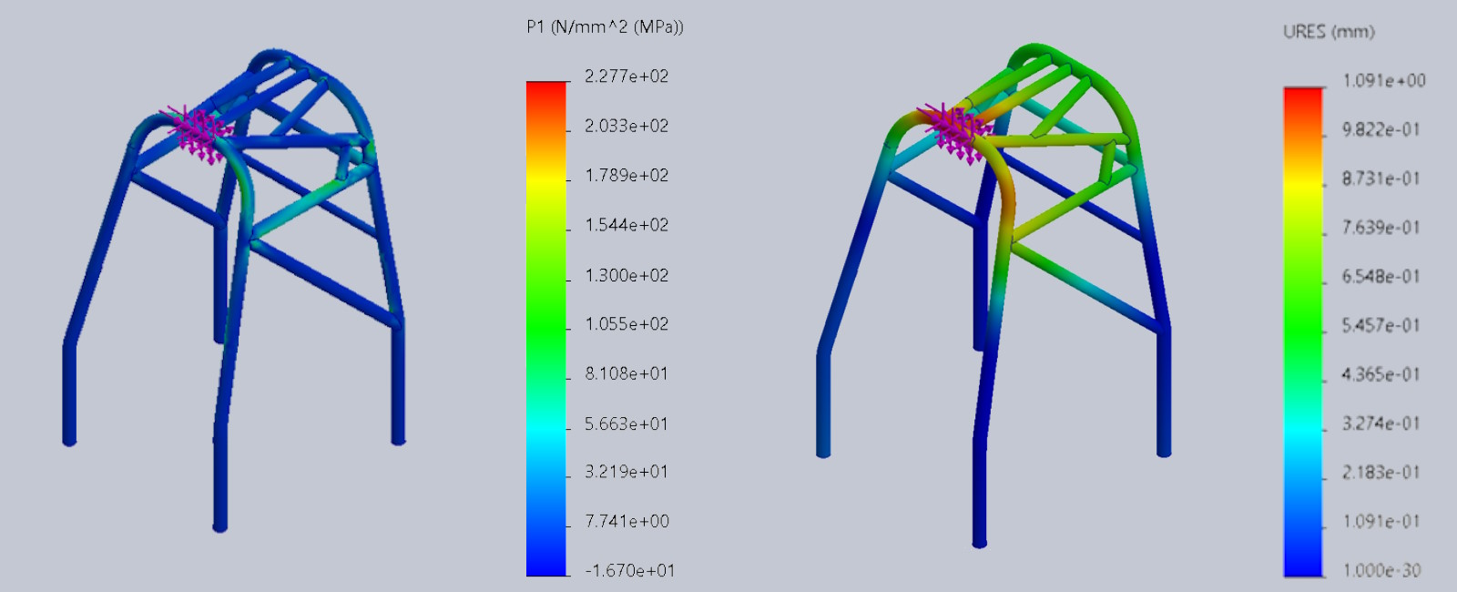 Front Roll Hoop Combined Loading (Left: Red elements show stress of 228 MPa, which is less than the yield strength of 435 MPa, Right: Red elements show deformation of 1.1mm)